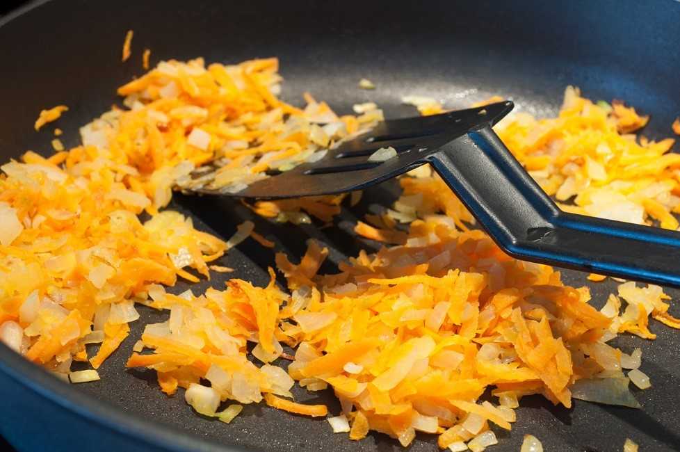 3. Зачищаем морковь и лук от кожуры. Лук мелко рубим на кубики, морковь трем на терке с крупными отверстиями. Отправляем измельченные овощи в разогретую с растительным маслом сковороду. Обжариваем до золотистого цвета постоянно помешивая.