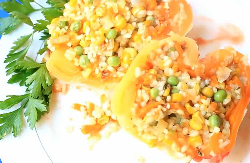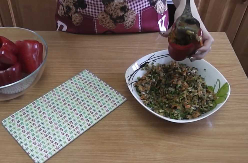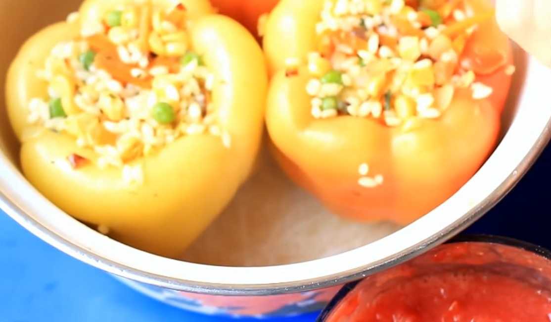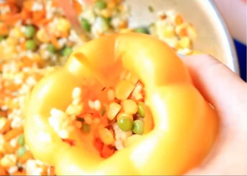 - Смешать овощи и рис, начинить подготовленные перцы.