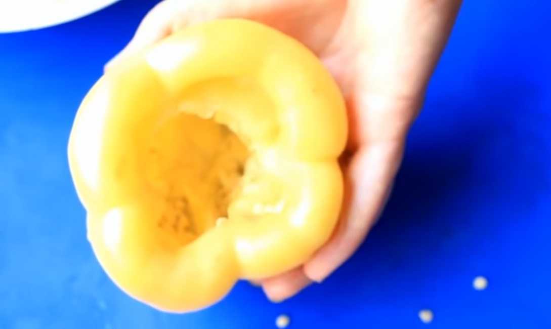 4. Подготавливаем перец. Разрезаем его на две половинки. Ножиком вырезаем все внутренние перегородки и удаляем семена.