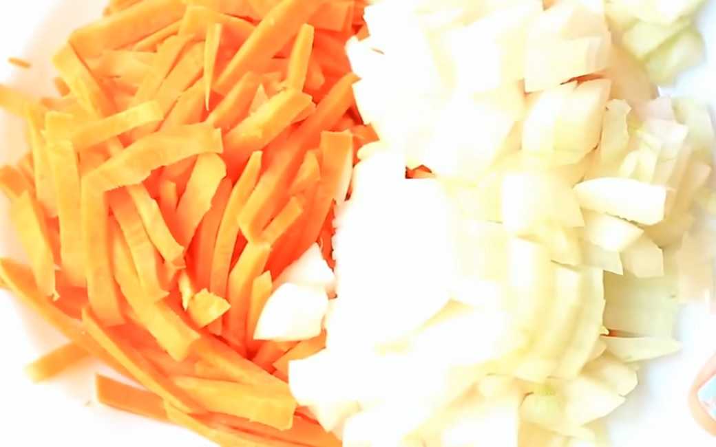 Лук и морковь очистить и измельчить. Морковь на крупной терке, лук мелким кубиком.