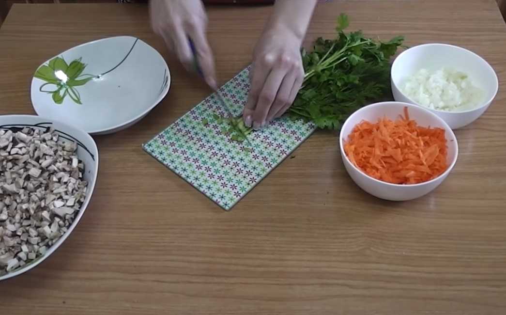 5. Обжарьте лук, грибы и морковь на растительном масле в течение 10 минут, подсолите, добавьте приправы. Под конец, уже выключив плиту, добавьте в сковороду зелень.