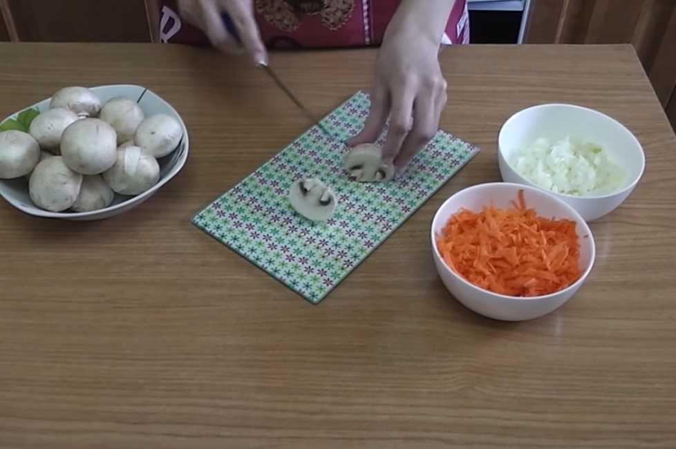 Перебрать, промыть и отварить гречневую крупу – около двух стаканов. Нашинковать капусту (1,5 ст.), почистить и нарезать луковицу, почистить, вымыть и натереть на крупной терке 2 средних моркови. Вымыть и мелко нарезать 200 г шампиньонов.
