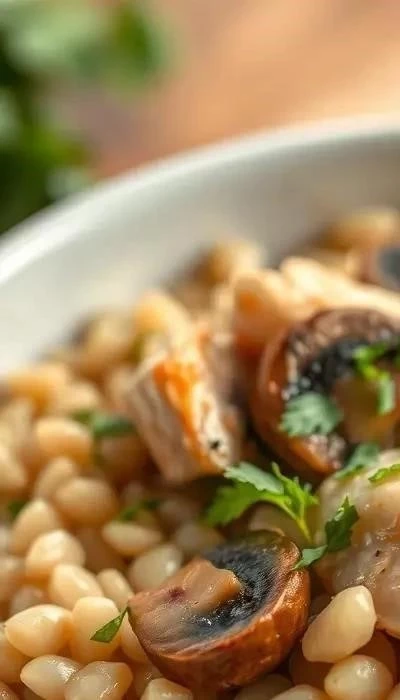 Подавайте перловку с курицей и грибами горячей, посыпав свежей зеленью (укропом, петрушкой). Блюдо отлично сочетается со свежими овощами или солеными огурцами. Приятного аппетита!