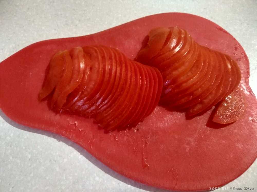 - Помидоры нарезать аналогично. Разложить на колбасе.