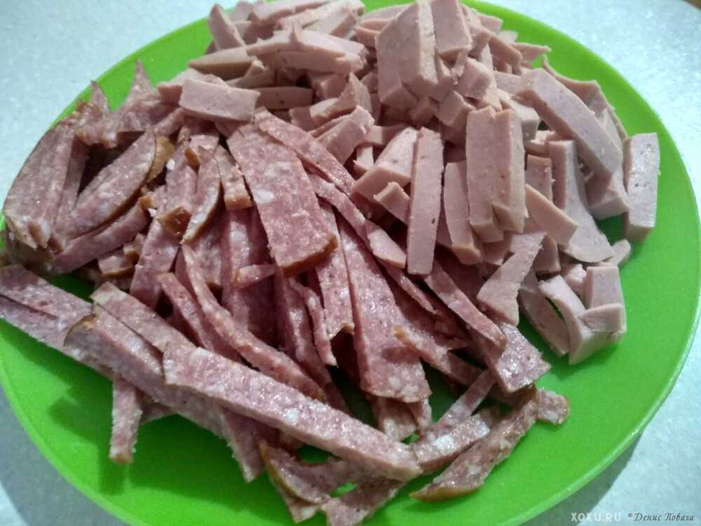 С основой мы разобрались, но не менее важным процессом является подготовка продуктов для начинки. Предлагаю начать с колбасы. Мы будем использовать два вида этого мясного деликатеса: молочную и полукопченою. Но несмотря на это нарезка будет абсолютно одинаковой — соломка.