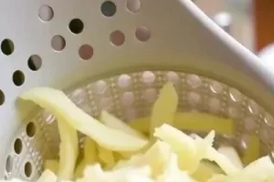 - Картофель отварить в мундире до готовности. Слить воду и хорошо размять в пюре. Дать пюре немного остыть.