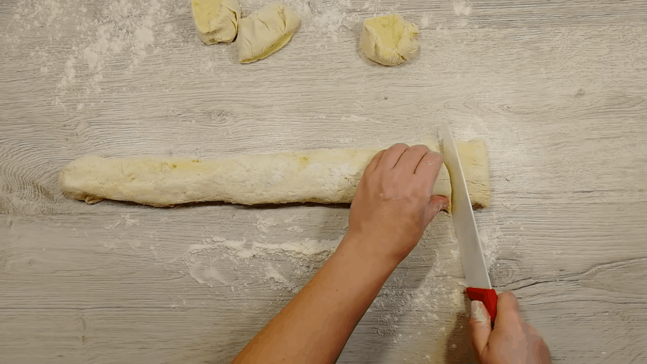Посыпьте стол мукой и скатайте тесто в колбаску. Разрежьте тесто на куски.
