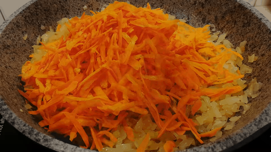5. На разогретую сковороду с растительным маслом выложить сначала морковь. Жарить до коричневого цвета её не нужно. Припустите три-четыре минутки, периодически помешивая, чтобы она не пригорала.