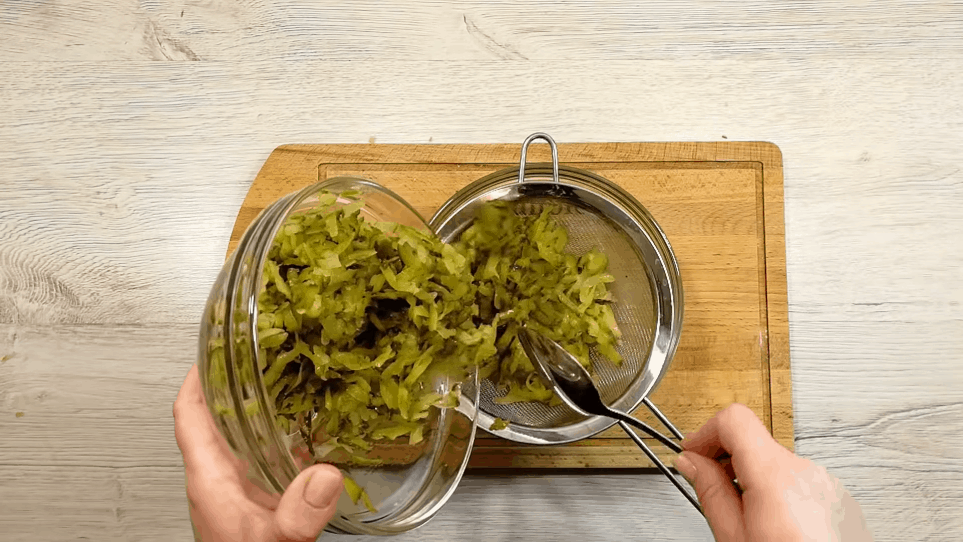 Соленые огурцы натираем на терке и тщательно отжимаем от жидкости.