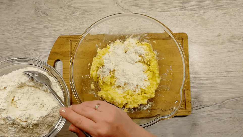 В несколько этапов добавляем муку и замешиваем картофельное тесто.