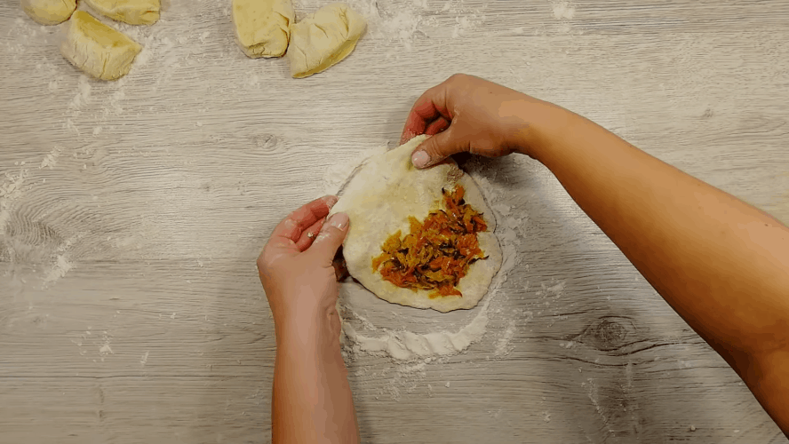 Тесто настолько податливое, что формировать лепешки для пирожков можно прямо руками. Сделав лепешку, равномерно распределяем начинку по одной половине, тут же накрываем второй и скрепляем края.