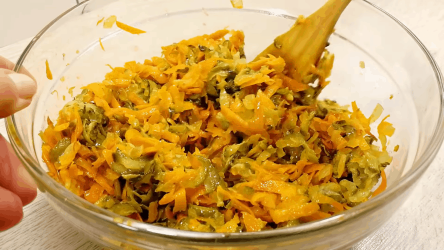 Соединяем обжаренную с луком морковь с огурцами и перемешиваем. Начинка готова.