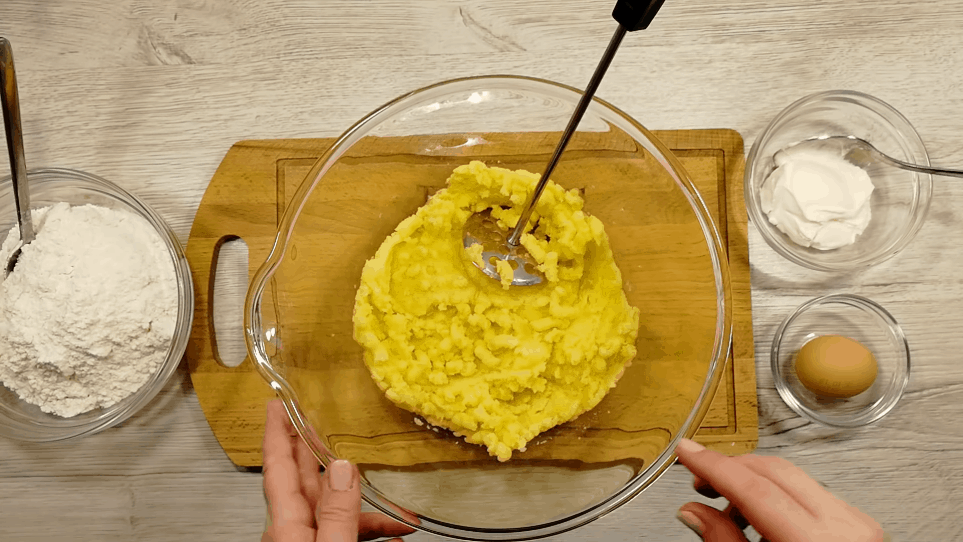 Разминаем картофель. Добавляем к нему яйцо и сметану и хорошо перемешиваем.