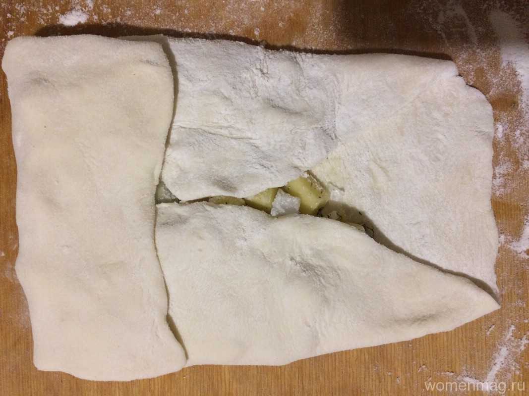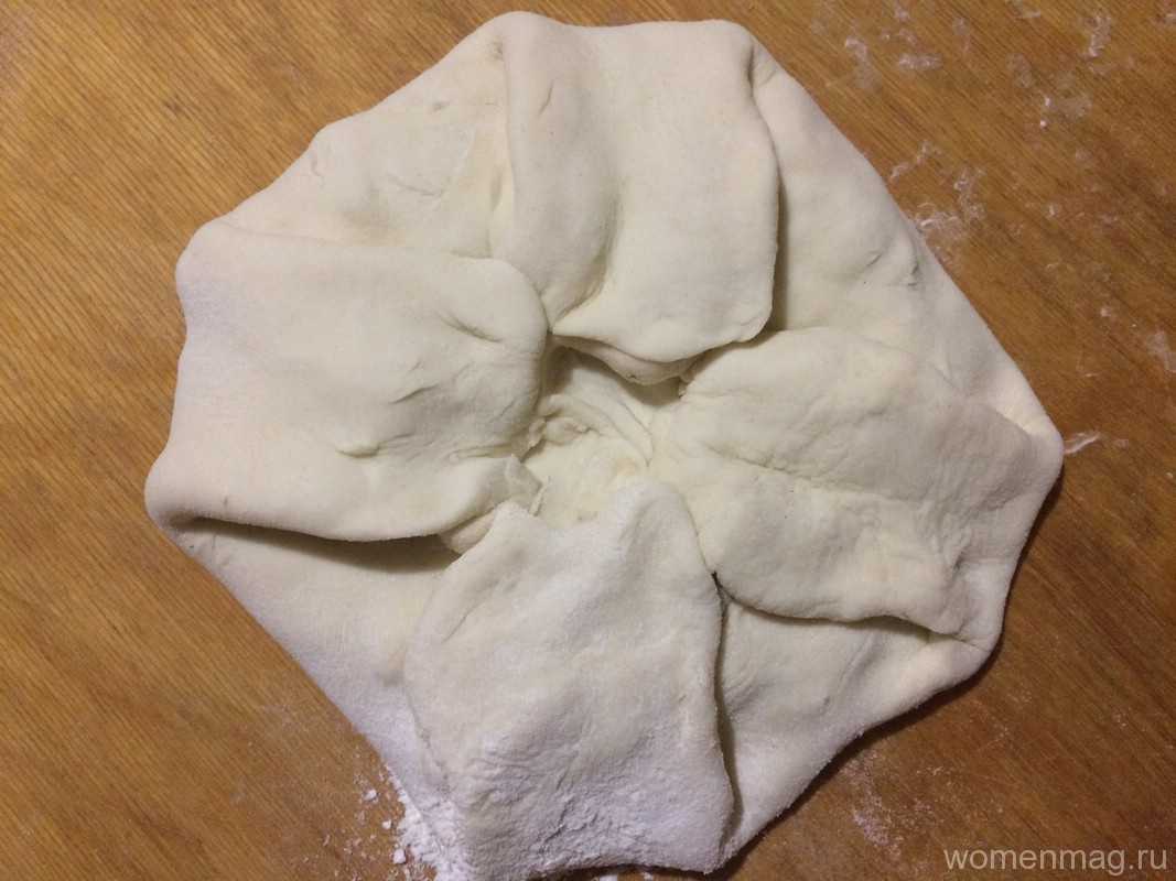 Закрываем начинку, оттягивая по очереди каждый край к центру лепешки.