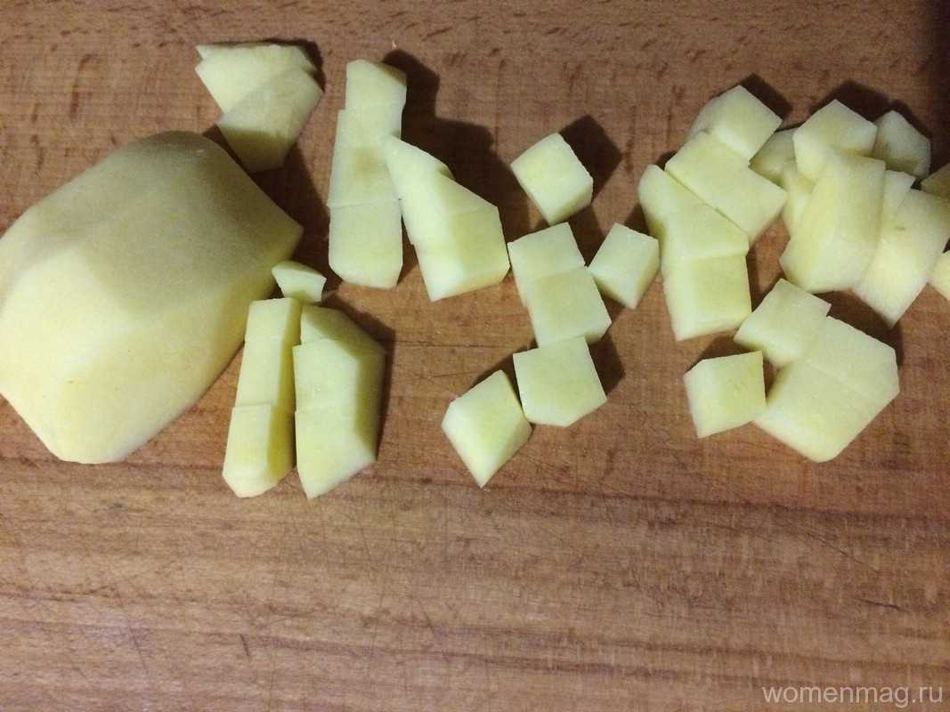 Нарезаем картофель очень маленькими кусочками. Кубики должны быть мельче, чем на суп, ведь от этого зависит, успеет ли приготовиться начинка за достаточно короткое время.