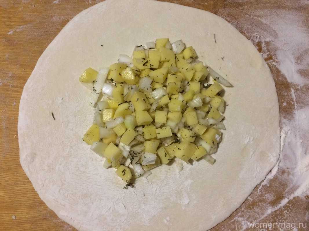 Раскатываем круг толщиной 2 мм, очень важно, чтобы он был достаточно тонким. На середину выкладываем начинку, края должны оставаться незаполненными