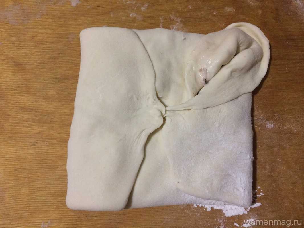 3. И начните приготовление, раскатайте каждую заготовку в кружок толщиной 7 мм, выложите начинку и затем защипите кверху в мешочек.