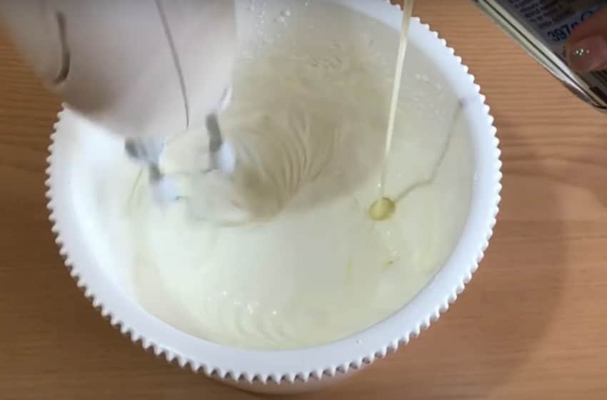 Затем вливаем в них сладкий сироп. Опять хорошо взбиваем. Масса увеличится и станет очень пышной. Закрываем заготовку пленкой или крышкой и отправляем в холодильник. Это вторая смесь.