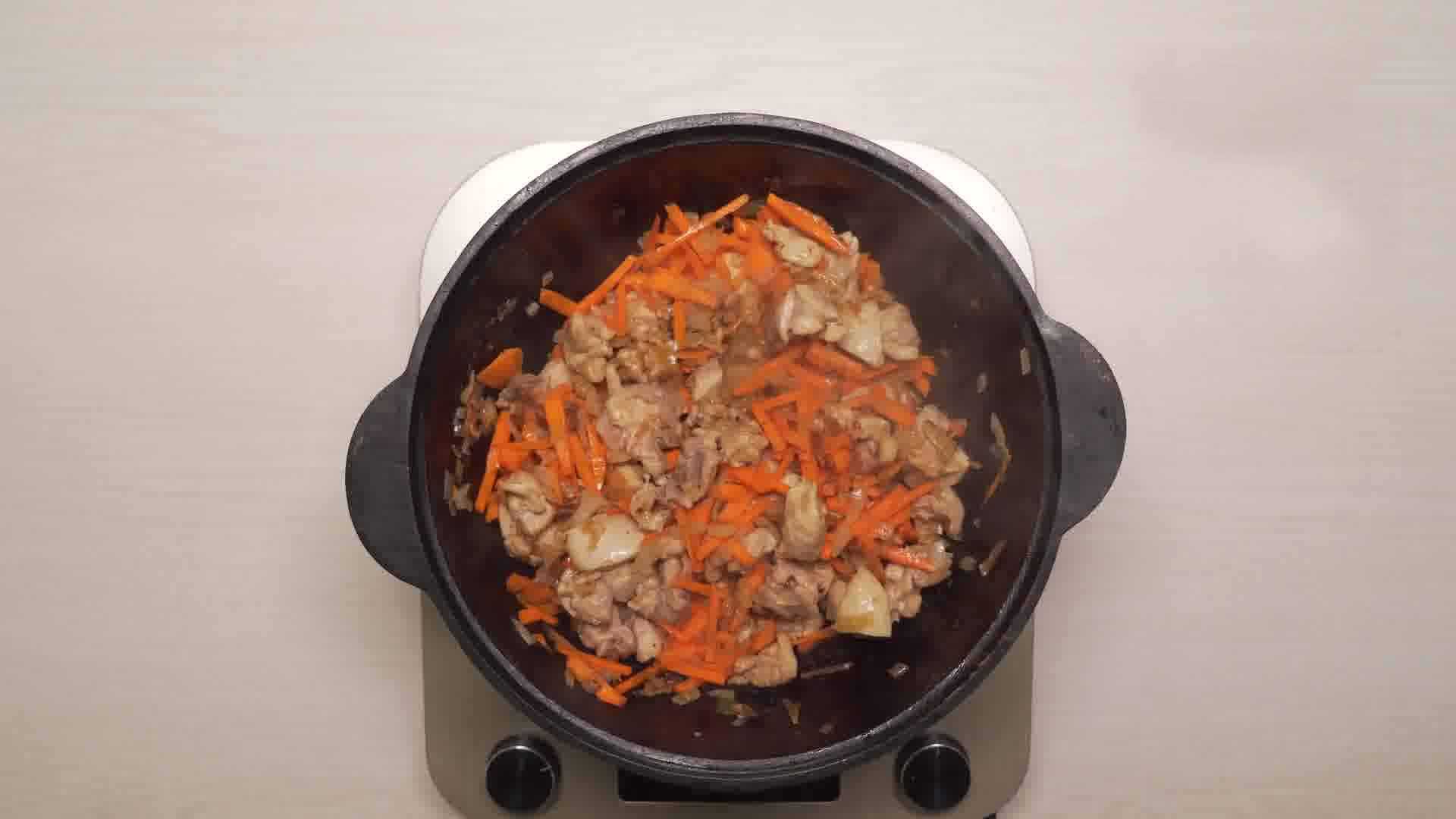 Следующим заходом добавляем в кастрюлю морковь. Её, наоборот, перемешивать не стоит. Накройте крышкой и немного убавьте температуру.