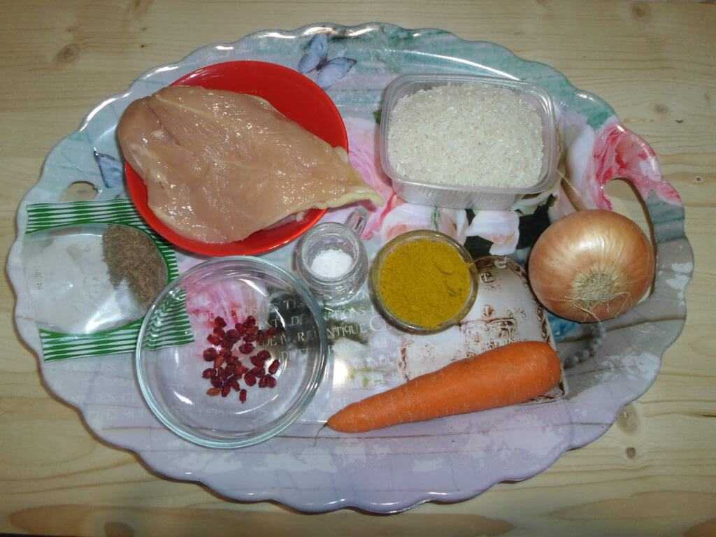 Традиционная рецептура подразумевает равное количество риса, мяса и моркови. А вот лука – чуть меньше, 500-700 грамм на каждый килограмм курицы.