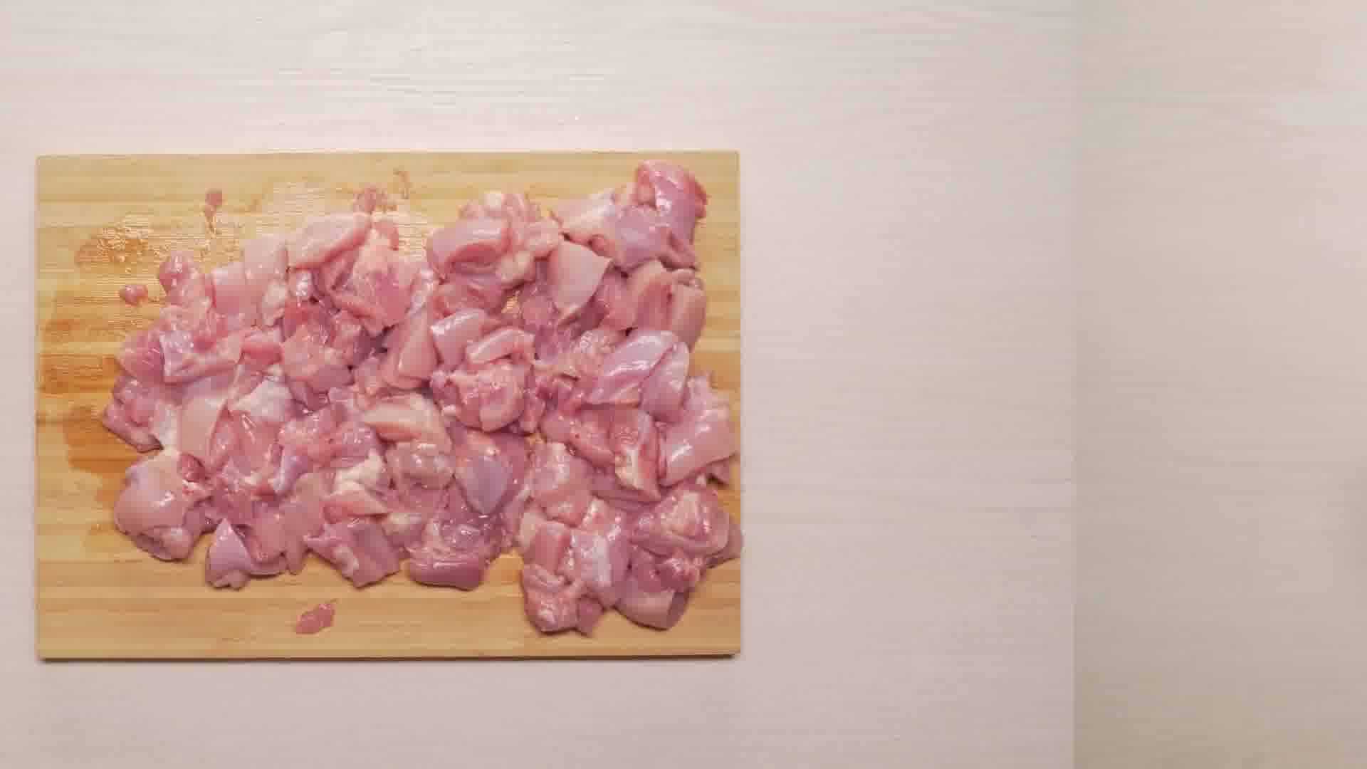 Куриное филе нарежьте тонкими полосками или квадратными кусочками. Если используете целую тушку, порубите ее таким образом, чтобы кусочки были примерно одинакового размера.