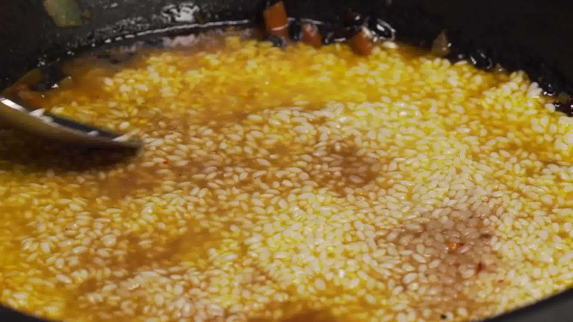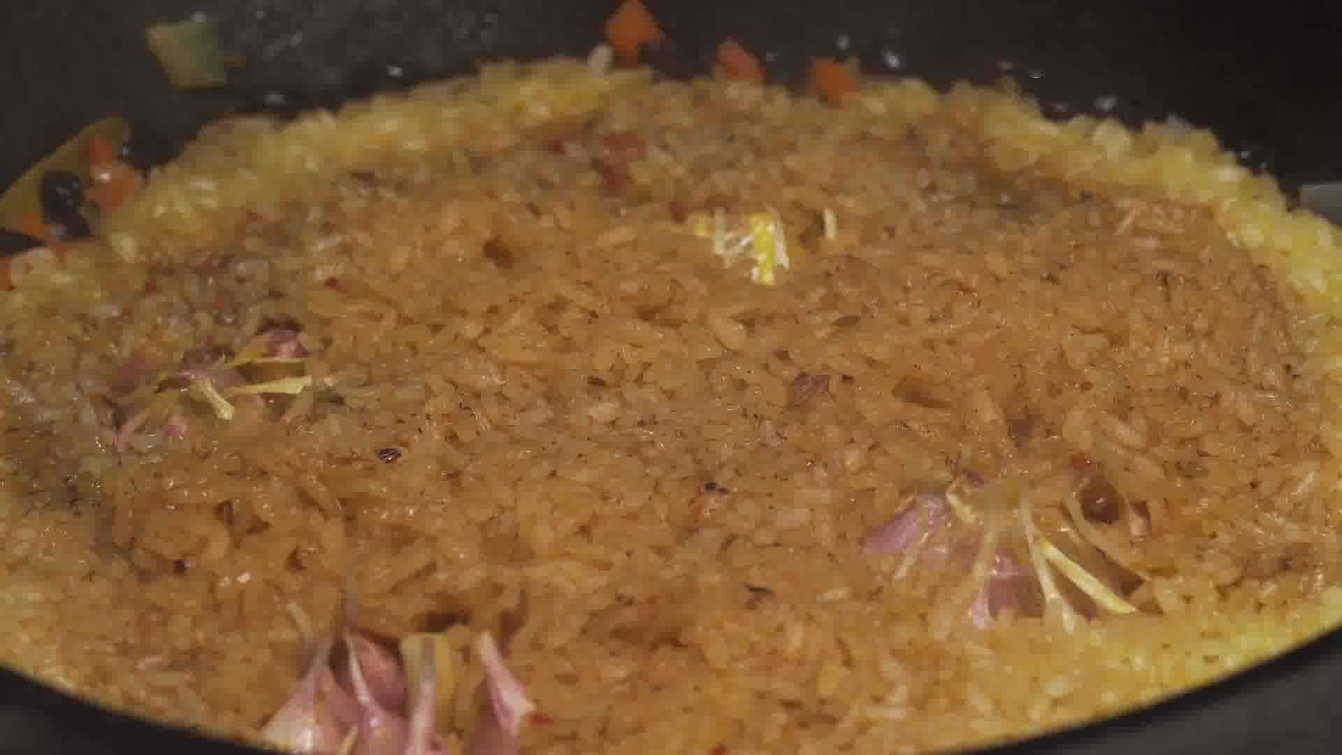 Нагрев можно увеличить, чтобы быстрее прошел процесс закипания и можно добавить вторую порцию зиры. Рис мы не перемешиваем, а только убираем от стенок к центру.