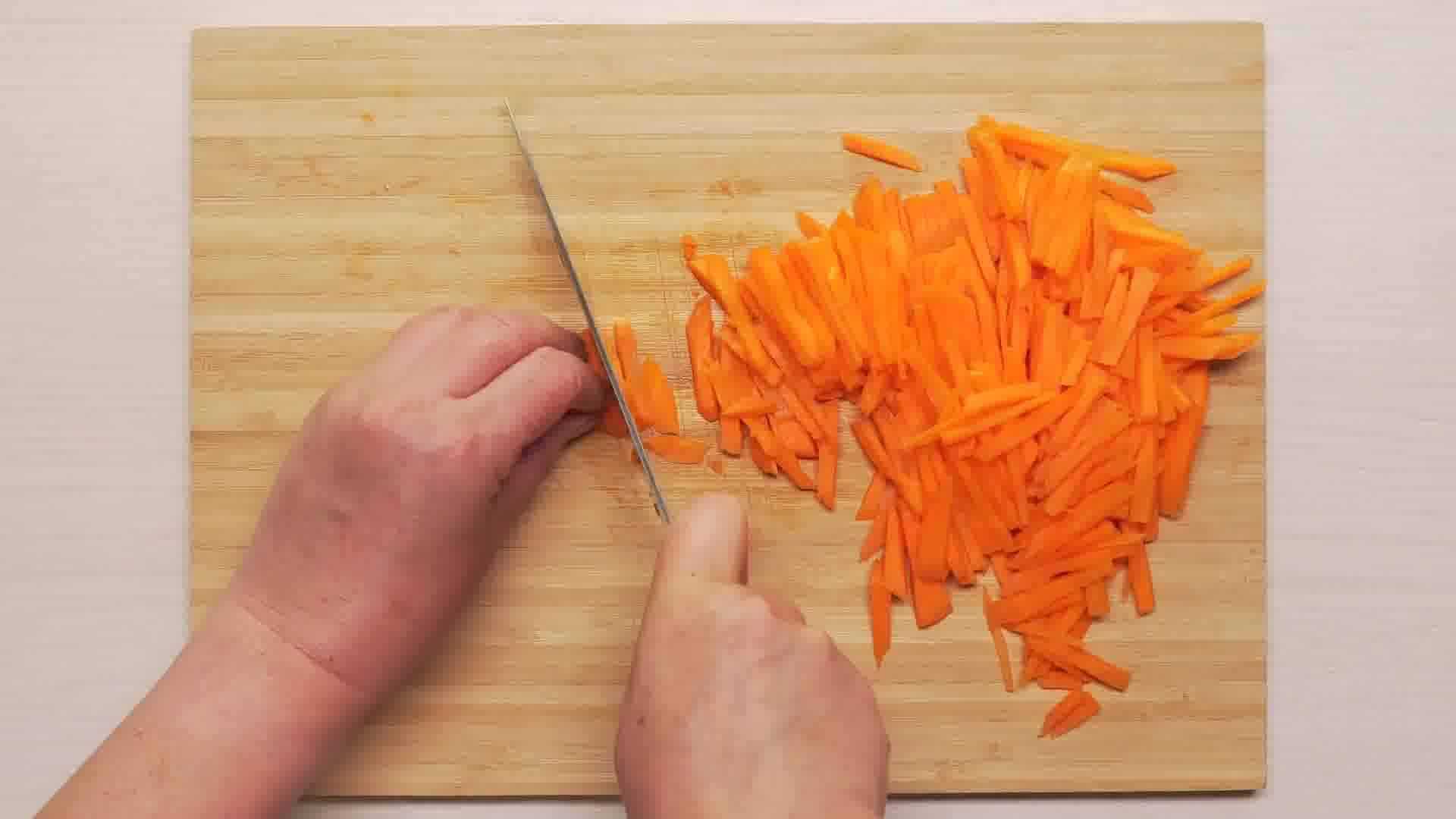 Морковку шинкуем соломкой, но можно воспользоваться теркой.