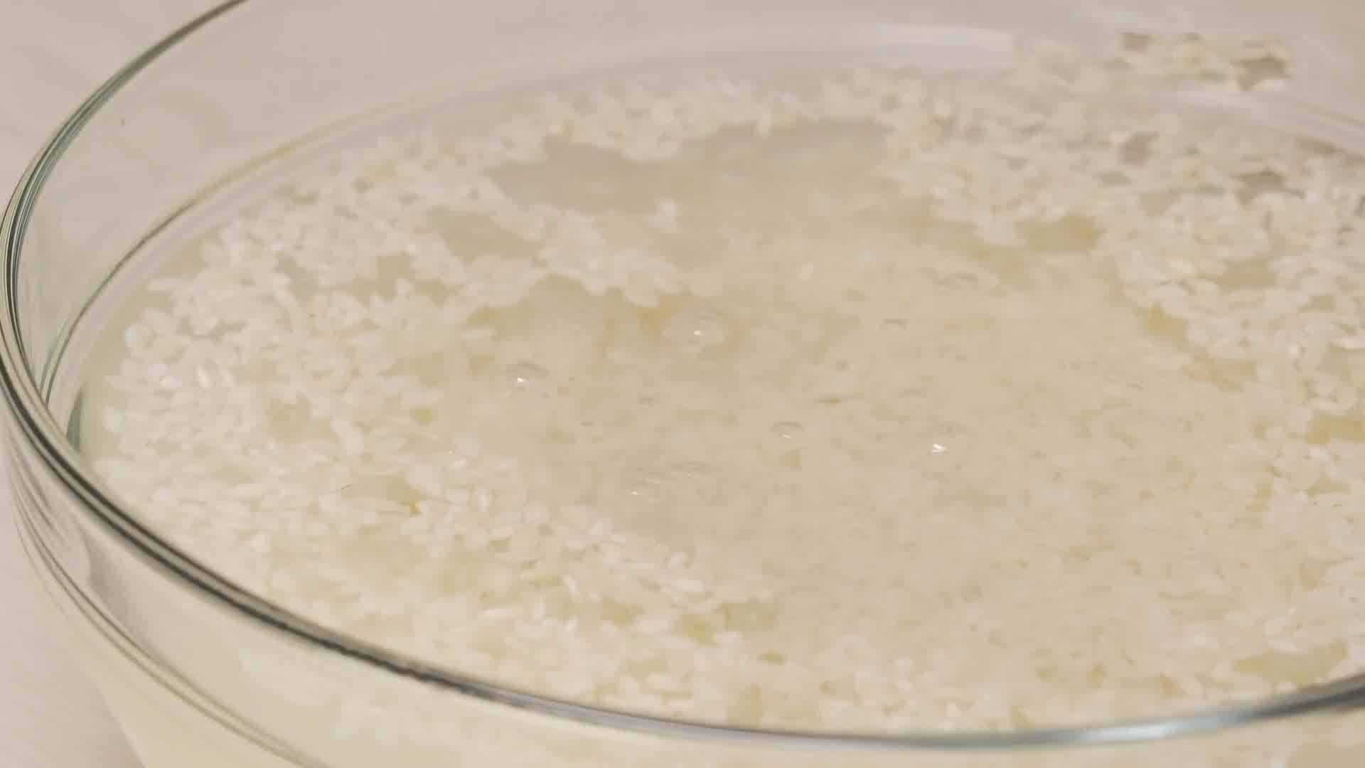 В это время замачиваем рис в тёплой воде на 30 минут, после чего промываем его в холодной воде, пока вода не станет полностью прозрачной. Замачивание риса позволяет не стоять над плитой в ожидании, когда выкипят излишки воды.