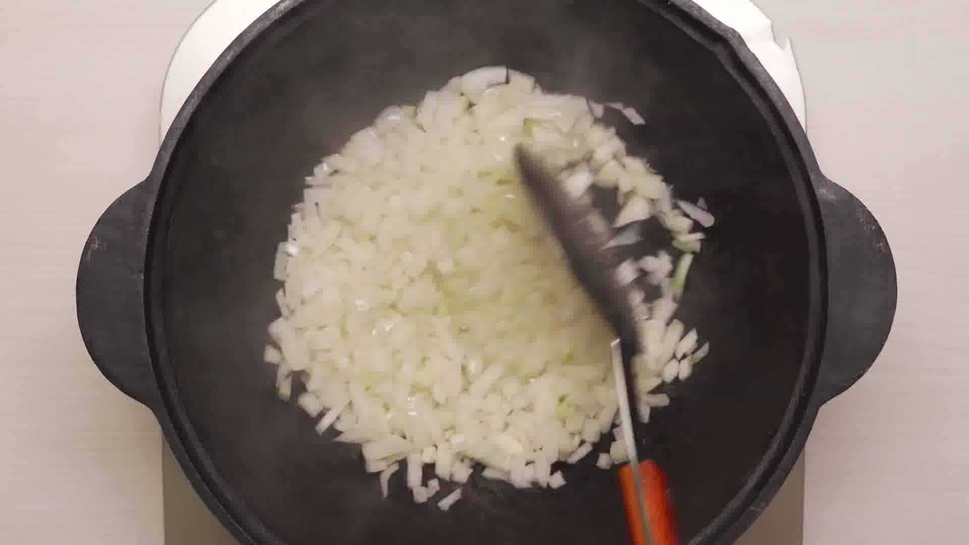 На дно казана вливаем масло для жарки, затем его нагреваем и добавляем порезанный лук, обжариваем 2-3 минуты на сильном огне.