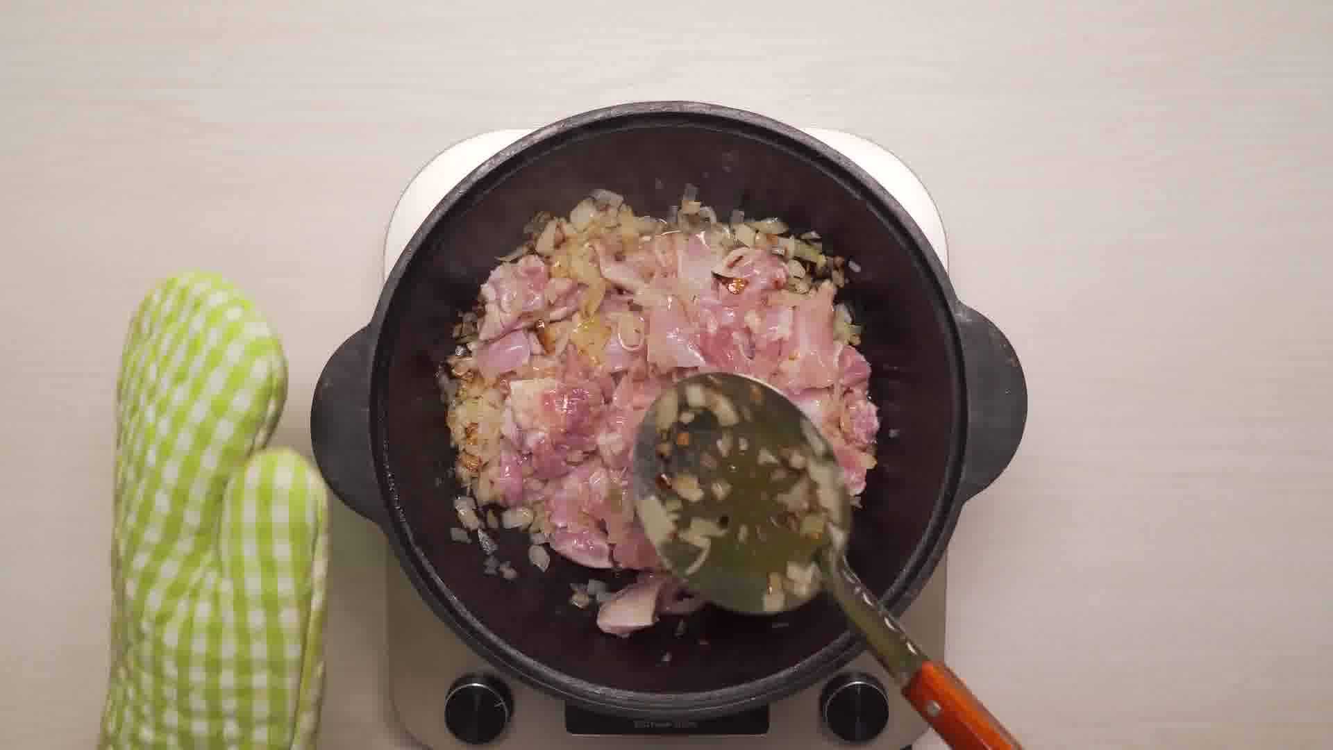 Как только лук становиться прозрачным я выкладываю в казан курицу, солю по вкусу и продолжаю обжаривать, перемешивая время от времени до образования румяной корочки.