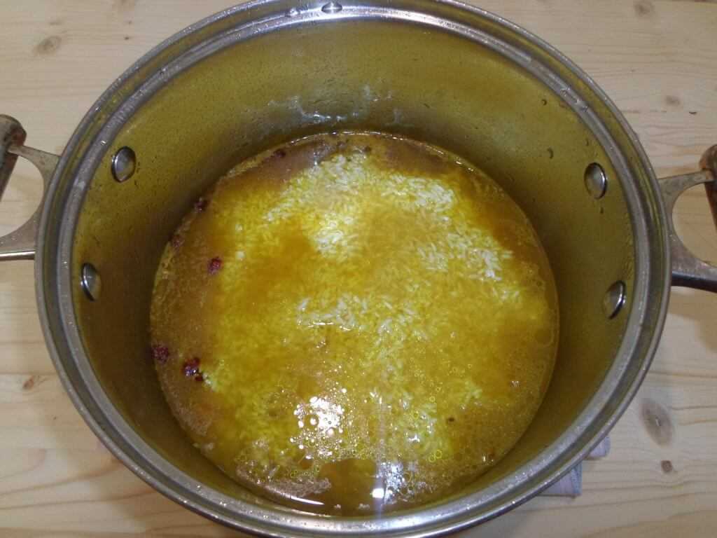 Сдвигаем рис от краев казана. Если бульона еще достаточно много, то можно сделать отверстия в рисе до дна.
