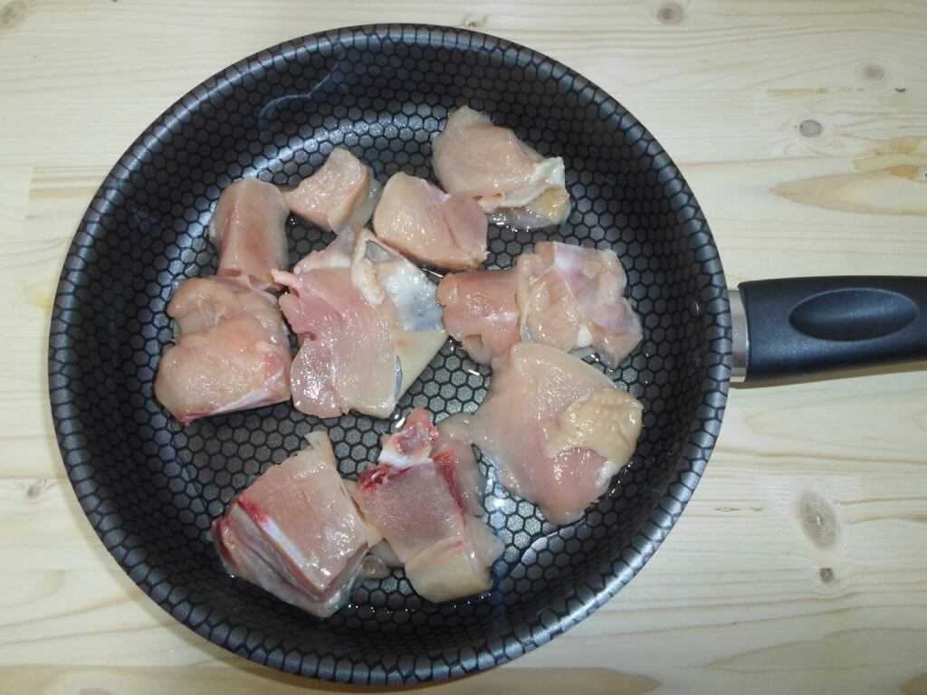Налейте в сковороду растительное масло, хорошо разогрейте и положите в него кусочки курицы.