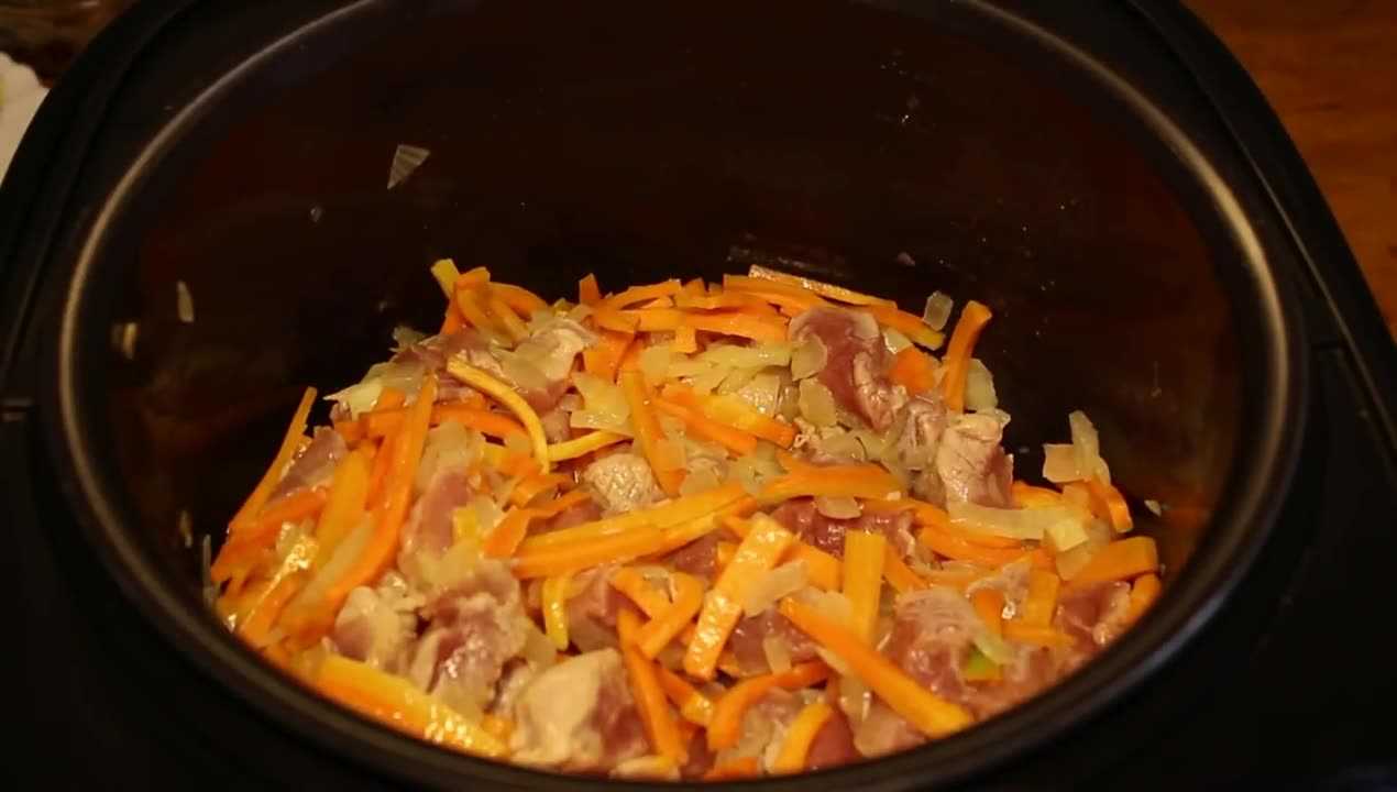 В оставшийся на огне казан всыпьте морковь и лук. Обжаривайте их до золотистого цвета.