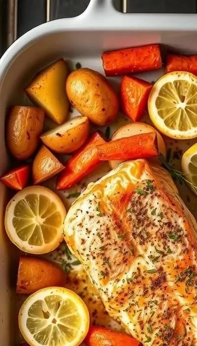 Ингредиенты: Лосось (400 г), брокколи (300 г), картофель (500 г), лимон (1 шт.), оливковое масло (2 ст.л.), соль, перец, чеснок (2 зубчика).