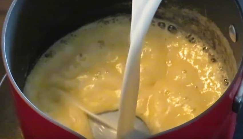 2. Вылейте все молоко и варите соус на среднем огне. На этом этапе непрерывно помешивайте его, чтобы не образовались комочки.