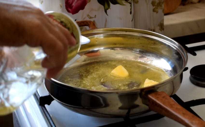 1. Поставьте сковородку на средний огонь и положите сливочное масло. Когда оно растопится наполовину, добавьте растительное масло и помешивайте до однородного состояния.