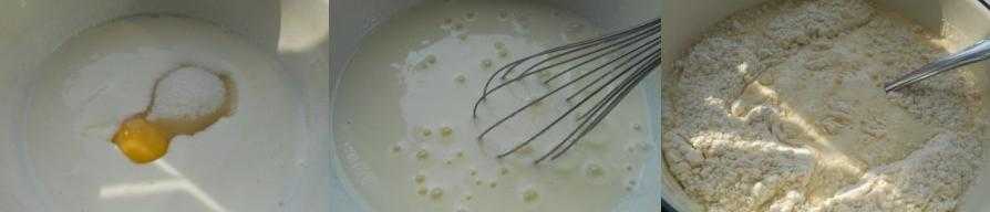В отдельной чаше и побольше соединяем сыпучие продукты — просеиваем муку, добавляем дрожжи и сахар. Если вы сомневаетесь в своих дрожжах, тогда приготовьте сначала опару. В теплое молоко добавьте дрожжи, немного сахара и хорошо перемешайте. Оставьте на несколько минут, чтоб дрожжи ожили.