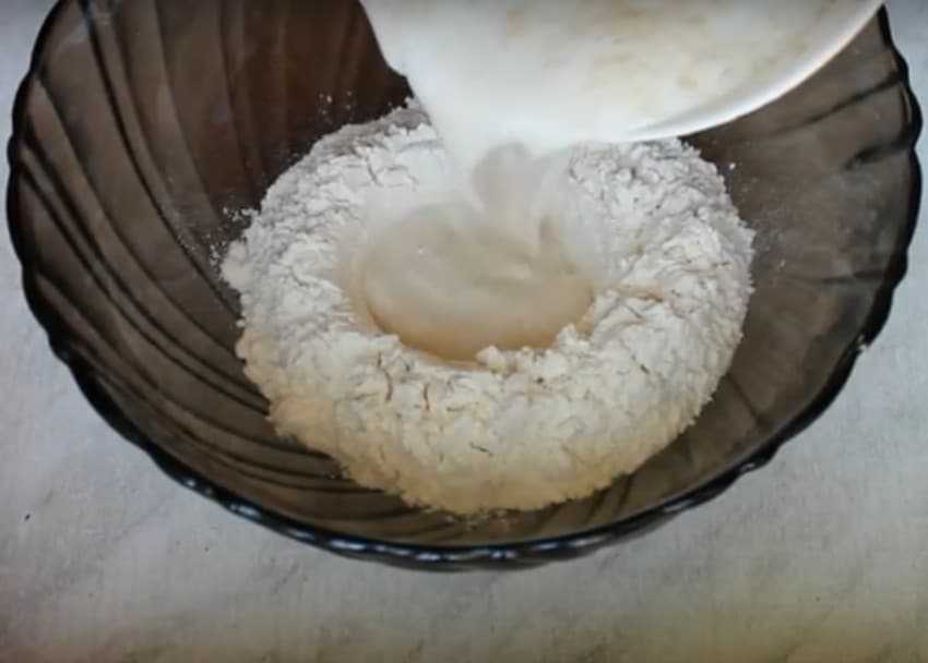- Воду добавляем в миску с мукой, перемешиваем, пока не разойдутся комки.