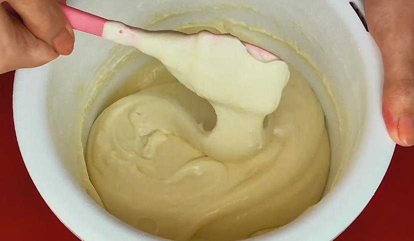 В итоге масса получается очень пышной, «воздушной», заметно гуще, чем на предыдущем шаге. На поверхности становятся видны следы от венчиков — после прекращения взбивания они постепенно заплывают. Для достижения такой консистенции нужно около 10 минут, но время может отличаться в зависимости от мощности миксера.