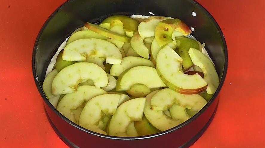 Дно формы выстелить пергаментом или же смазать сливочным маслом. Вылить 1/3 тестовой массы, выложить на нее яблочные дольки, слегка вдавливая их в тесто.