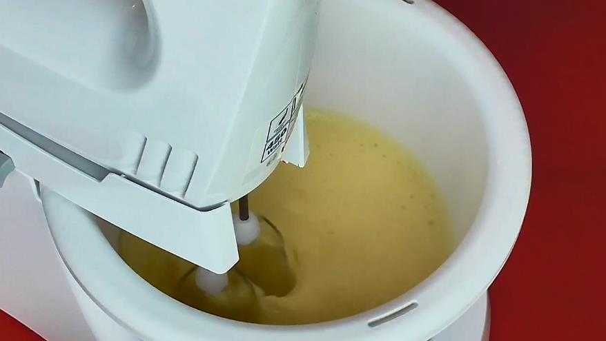 - Постепенно добавьте разрыхлитель теста и кефир, продолжая взбивать массу;