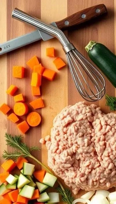 Ингредиенты: 500 г фарша из индейки, 1 кабачок, 1 морковь, 1 луковица, 1 яйцо, 2 ст.л. муки, соль, перец по вкусу.