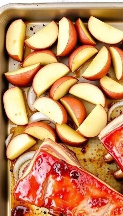 - Выложите картофель и лук на противень к ребрышкам за 30 минут до окончания запекания.