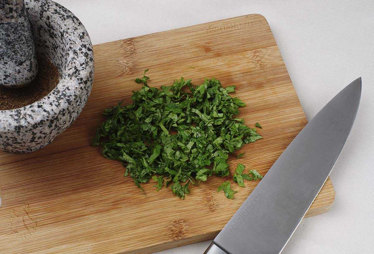 3. Свежую кинзу мелко порезать, семена тмина растереть в ступке в порошок. Вместо кинзы в это блюдо можно также добавить петрушку.