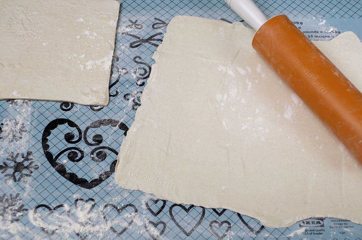 8. Слоеное бездрожжевое тесто разморозить и тонко раскатать на присыпанной мукой поверхности.