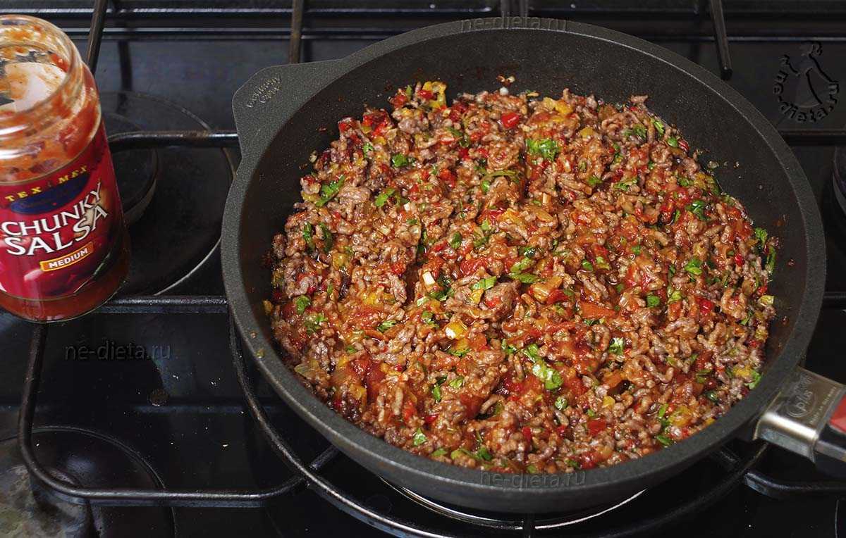 Лук и чеснок измельчаем и обжариваем в смеси растительного и сливочного масла до размягчения. Добавляем фарш, кумин, порошок чили, паприку, говяжий бульон, соль и перец.