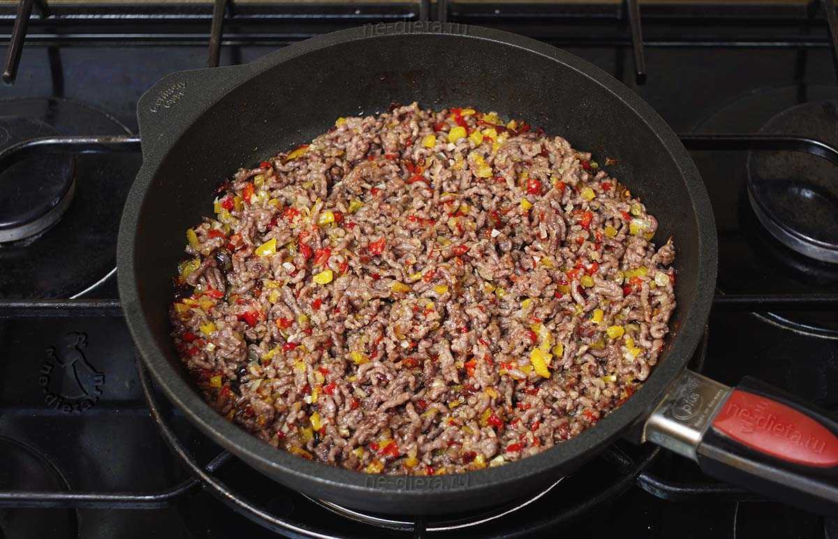 6. Выложить мясной фарш, перемешать и готовить 8 — 10 минут, пока весь фарш не потемнеет. Вылить из сковороды лишнюю жидкость вместе с выделившимся из мяса жиром.