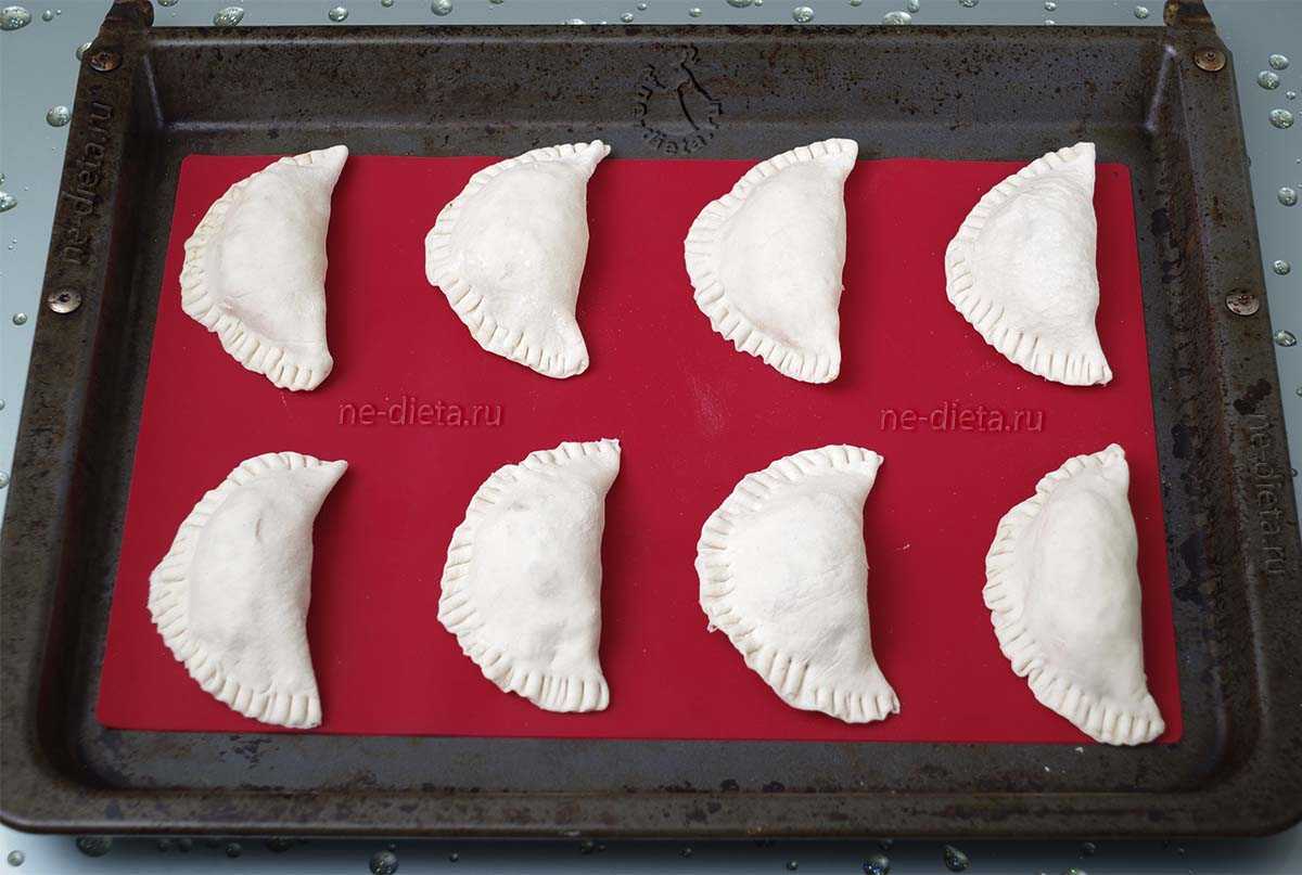 10. Пирожки выложить на противень, застеленный пергаментом или специальным силиконовым ковриком. Выпекать в разогретой до 200°С духовке 18 – 20 минут до румяной корочки.