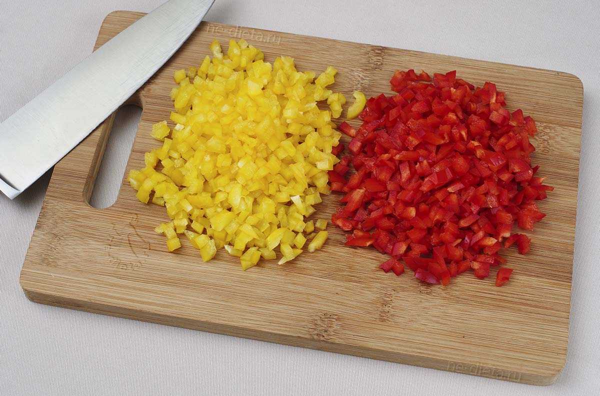 2. Болгарский перец освободить от семян и нарезать сначала вдоль тонкими полосками, а затем поперек мелкими кубиками.