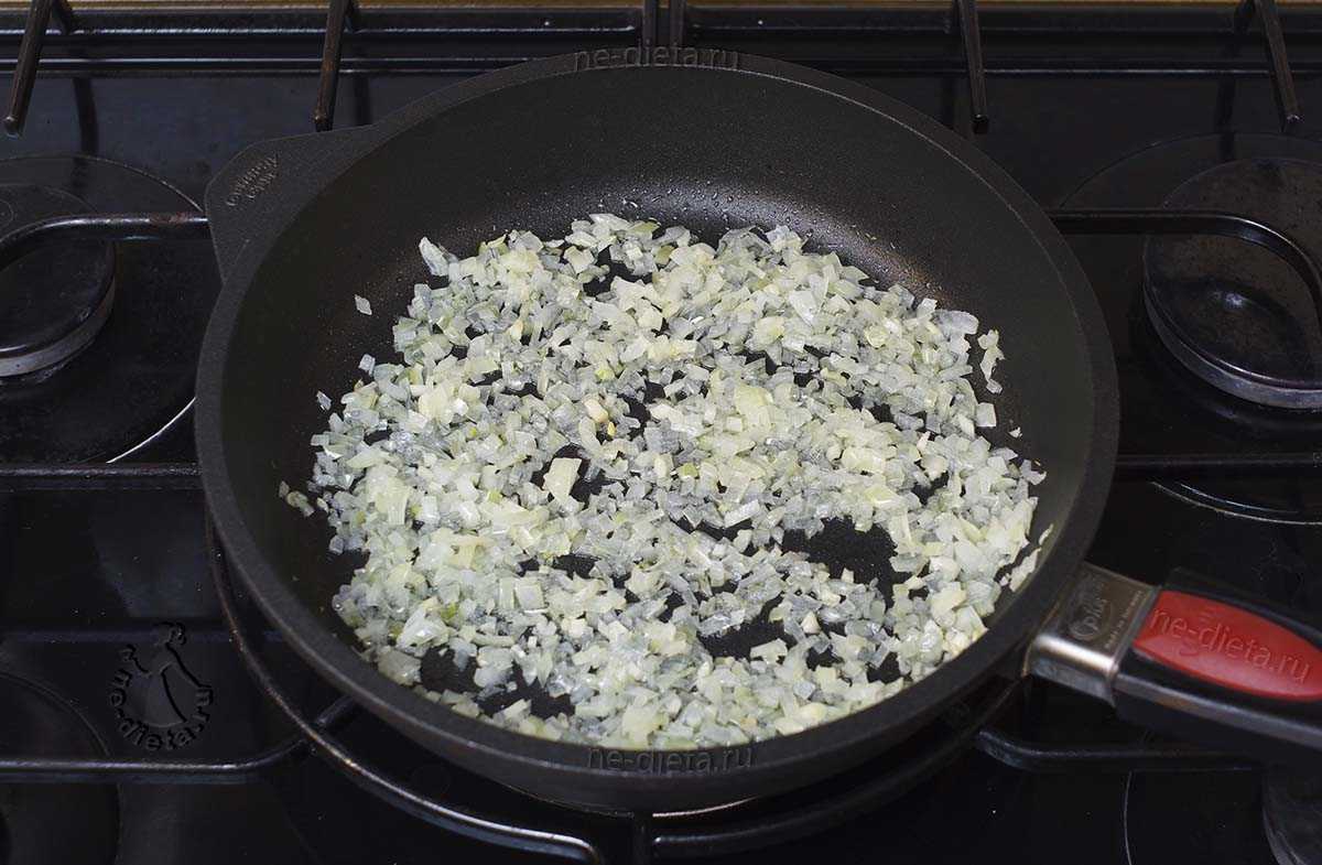 На сковороде разогреваем растительное масло и обжариваем лук до прозрачности в течение 2-х минут на среднем огне при помешивании.